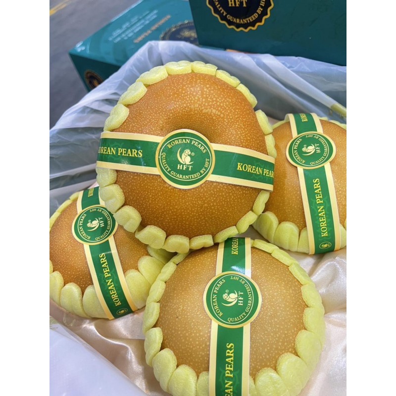 Korean pear is a must-try! Korean pears (also known as 'singo' and 'sand' pears) are what we might call pampered produce - grown purposefully with fewer pears per branch and encased in little jackets while still on the tree to ensure thin, unblemished, perfect skin!